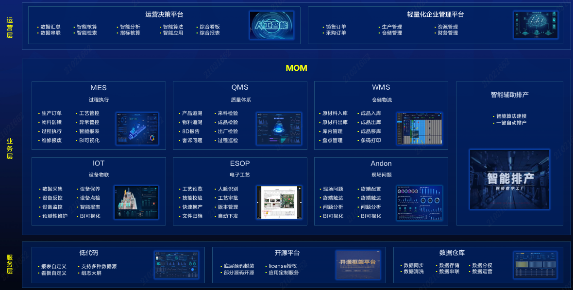 面向电子装配领域制造业,围绕企业数字化转型升级实用场景,打造统一管理MOM运营平台,为企业提供包括生产(MES)、质量(QMS)、仓储(WMS)、设备物联、电子工艺、现场问题管理等业务支持,为企业提供一体化运营管理整套系统解决方案。